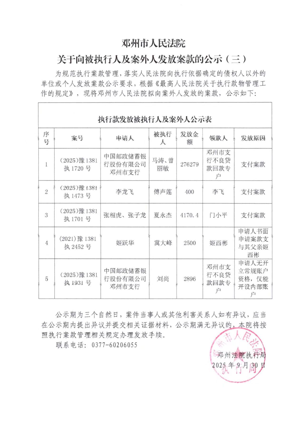 邓州市人民法院关于向被执行人及案外人发放案款的公示(三)