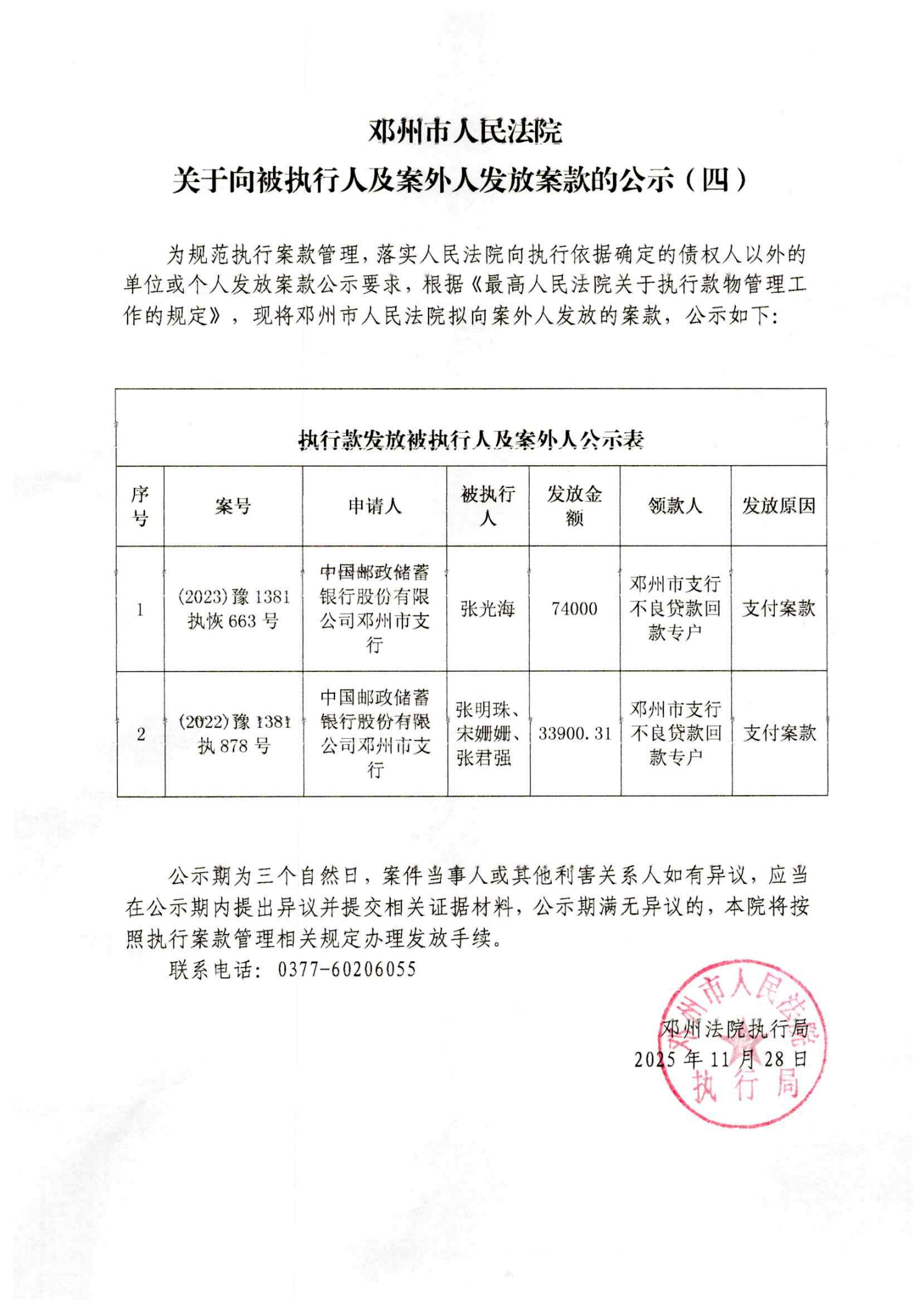 邓州市人民法院关于向被执行人及案外人发放案款的公示(四)