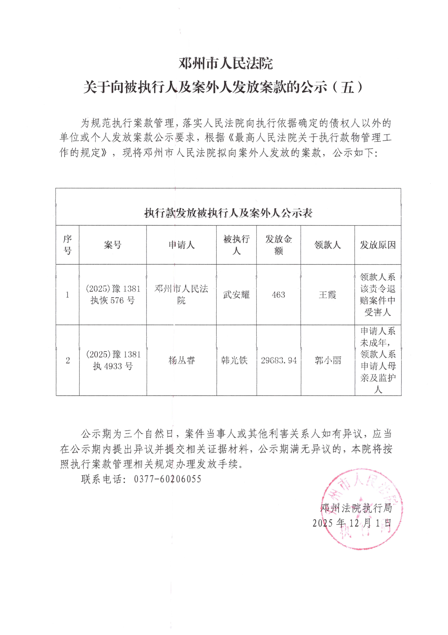 邓州市人民法院关于向被执行人及案外人发放案款的公示(五)