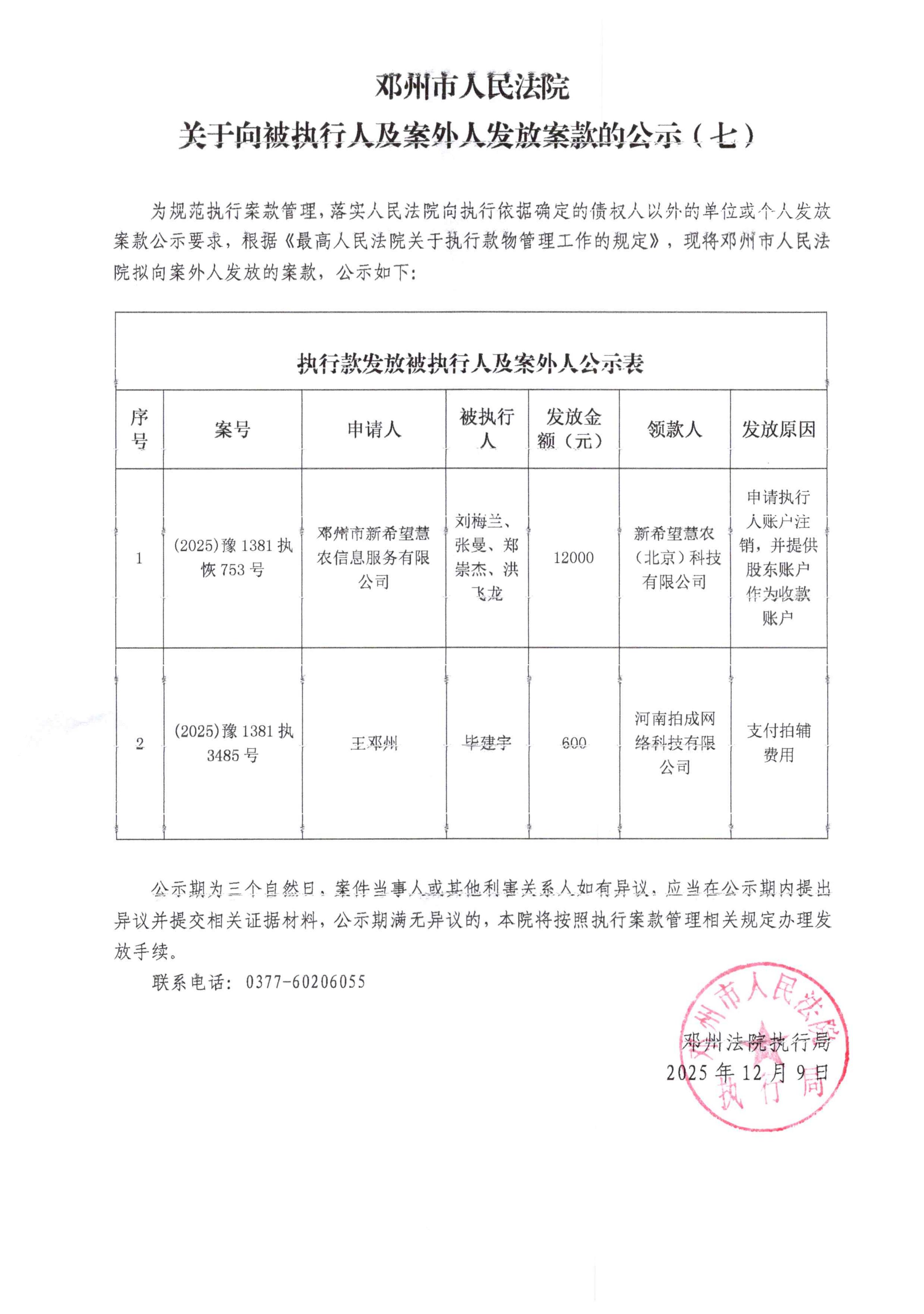 邓州市人民法院关于向被执行人及案外人发放案款的公示(七)