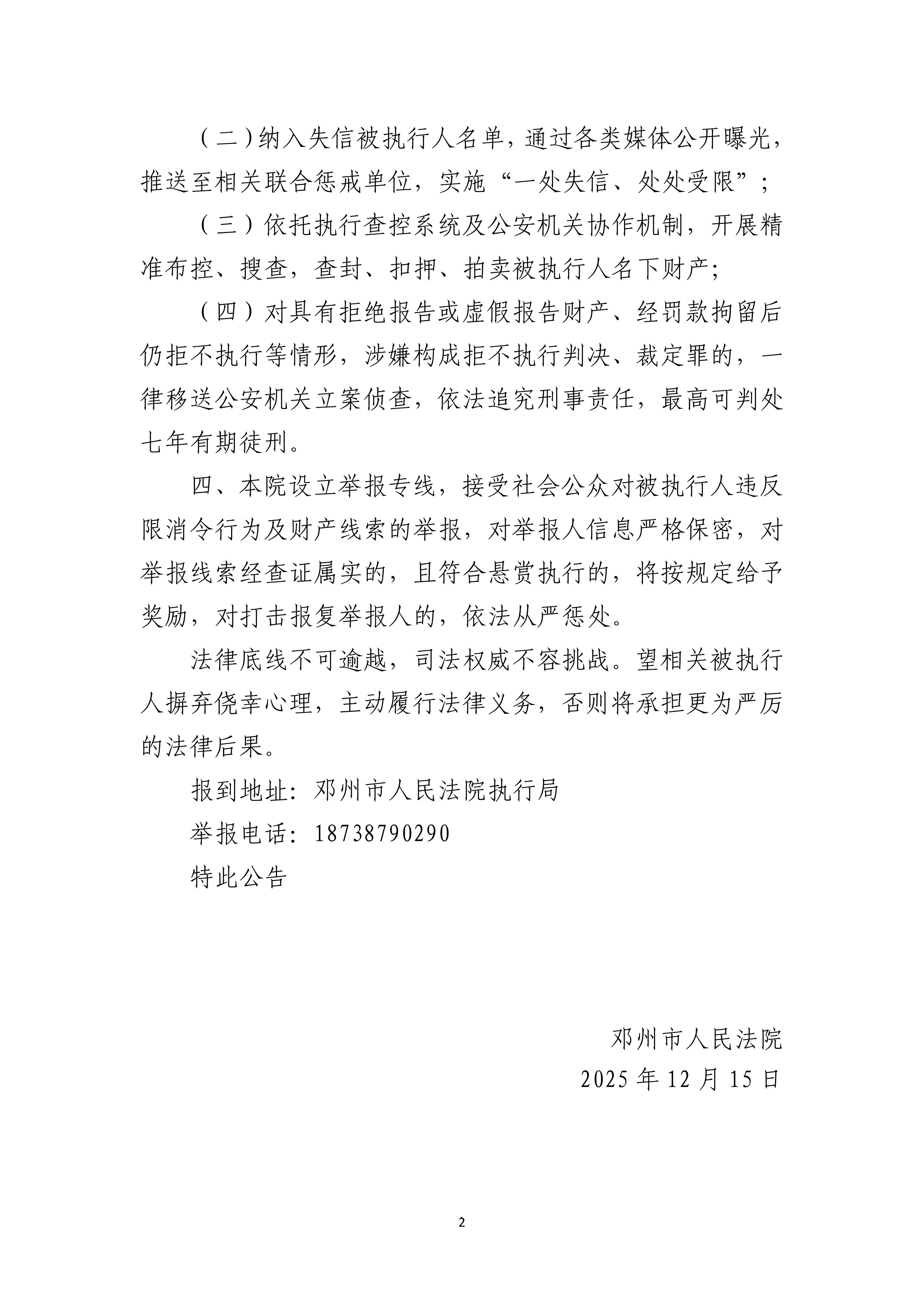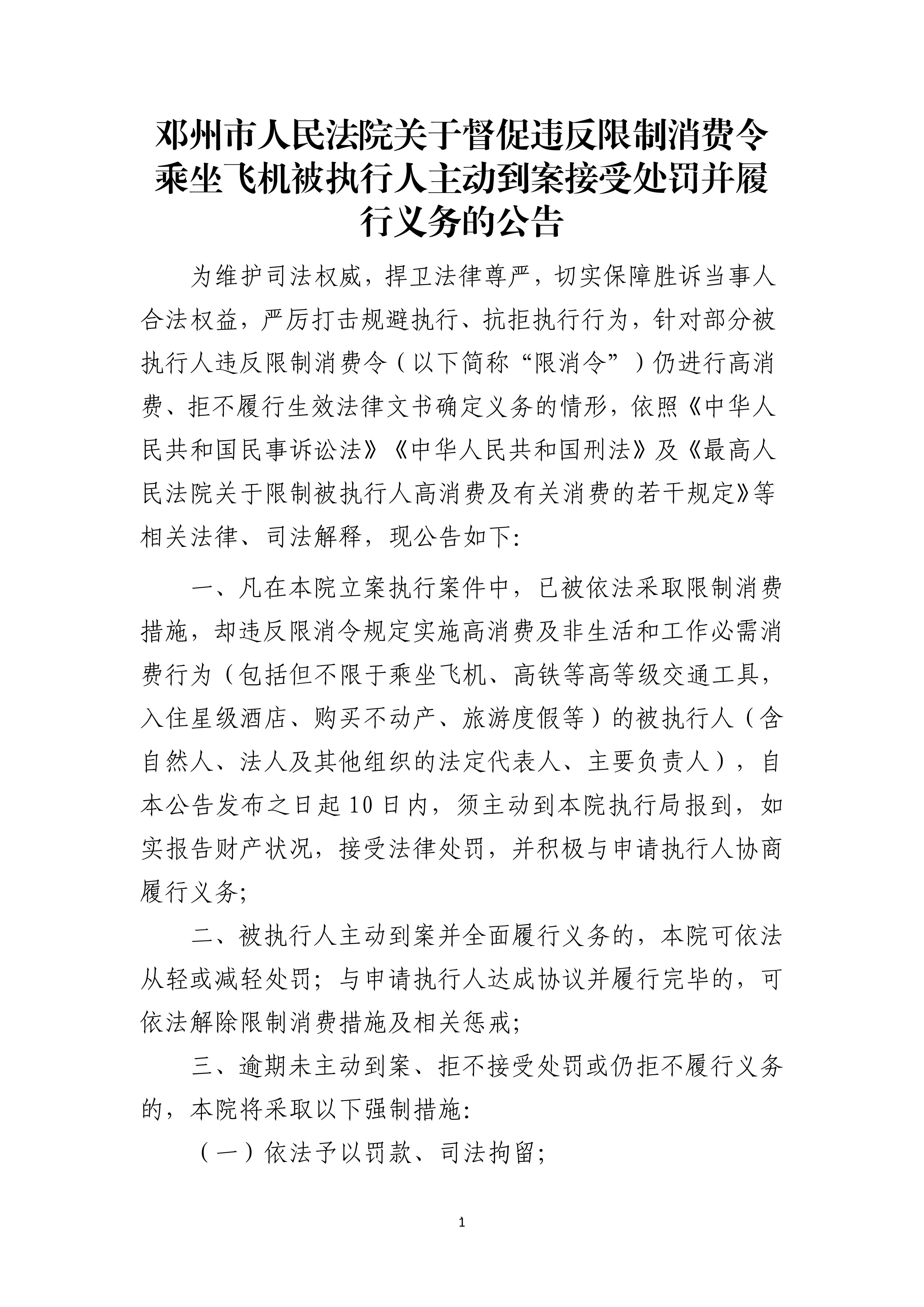 邓州市人民法院关于督促违反限制消费令乘坐飞机被执行人主动到案接受处罚并履行义务的公告