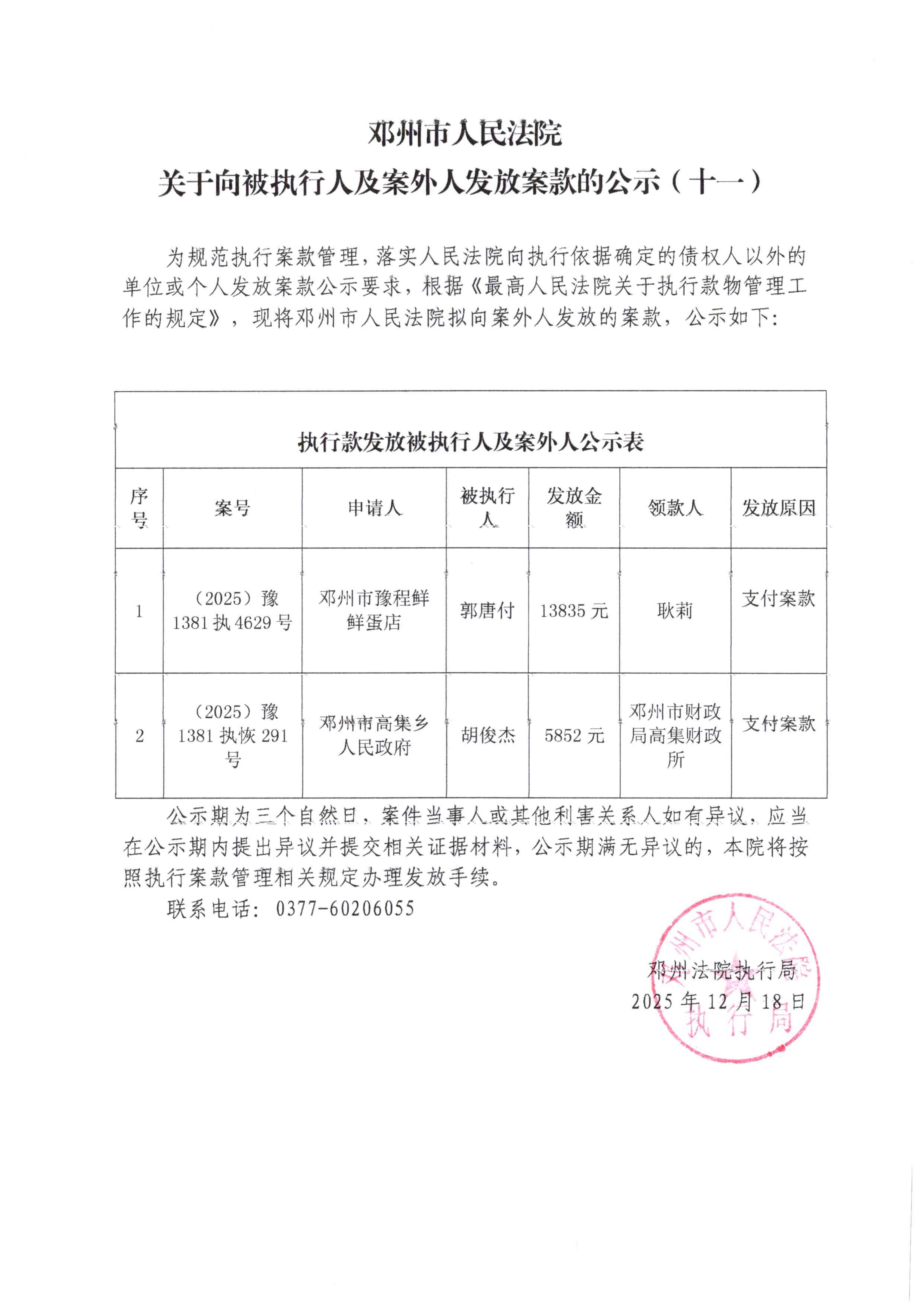邓州市人民法院关于向被执行人及案外人发放案款的公示(十一)