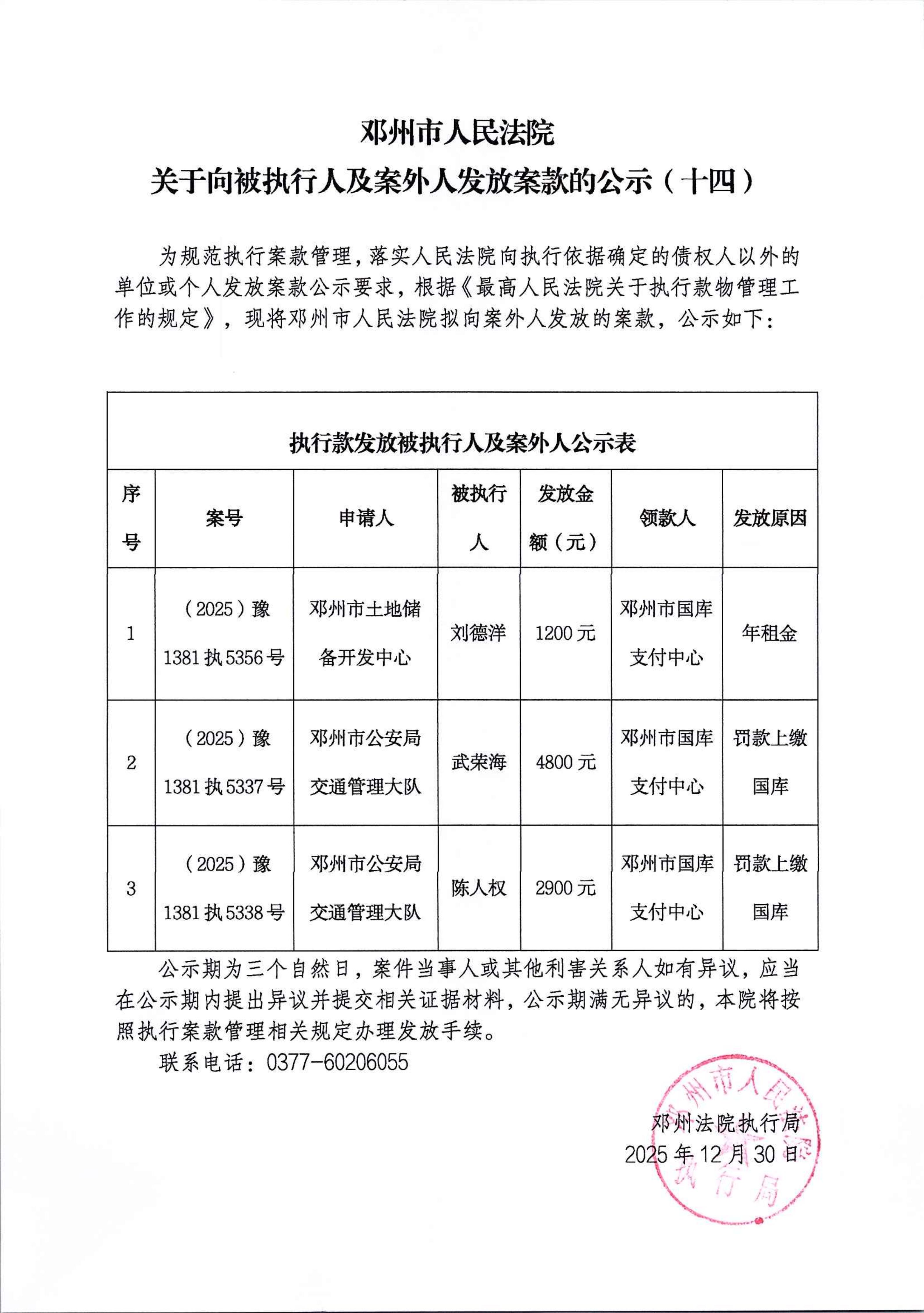 邓州市人民法院关于向被执行人及案外人发放案款的公示(十四)