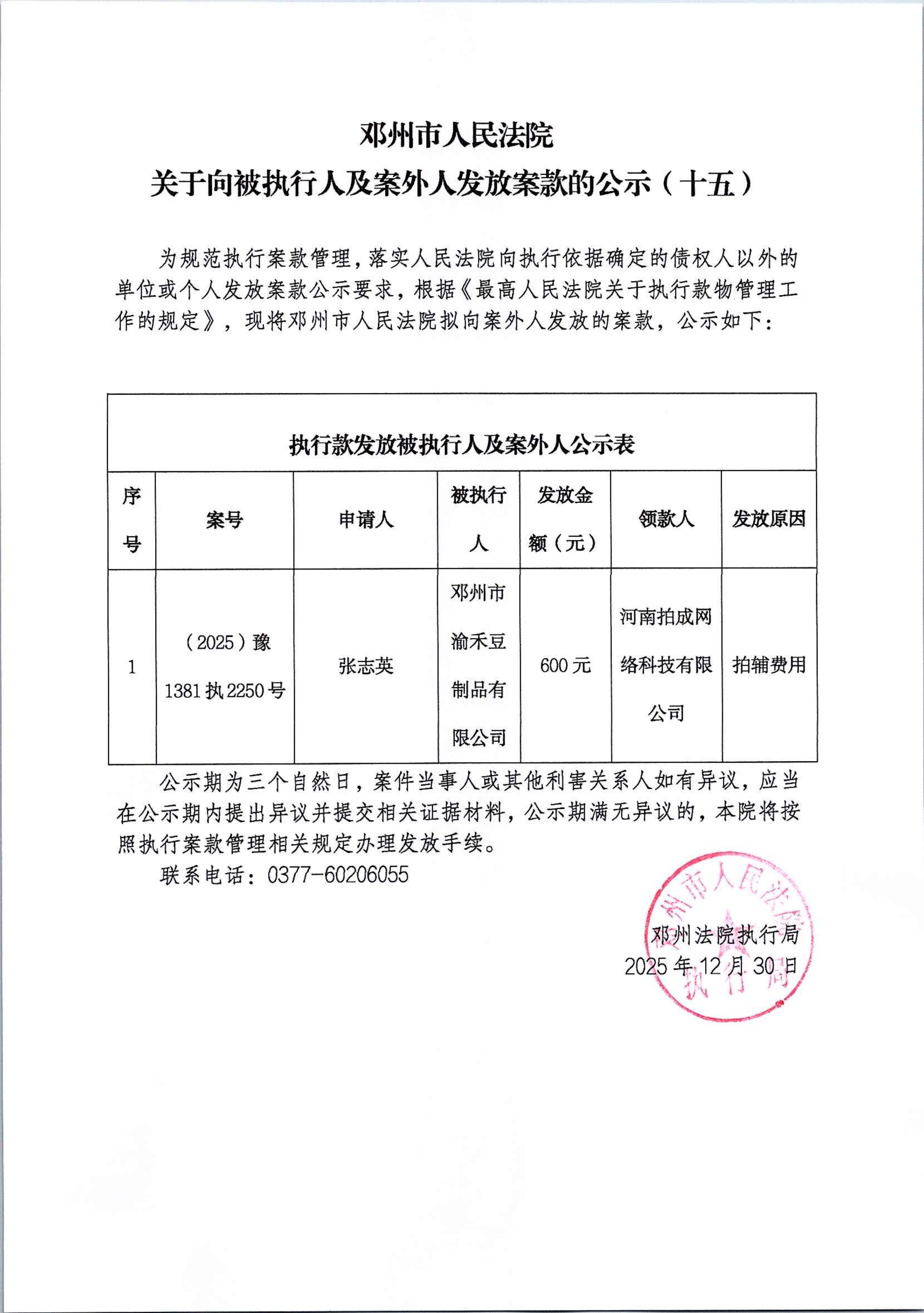 邓州市人民法院关于向被执行人及案外人发放案款的公示(十五)
