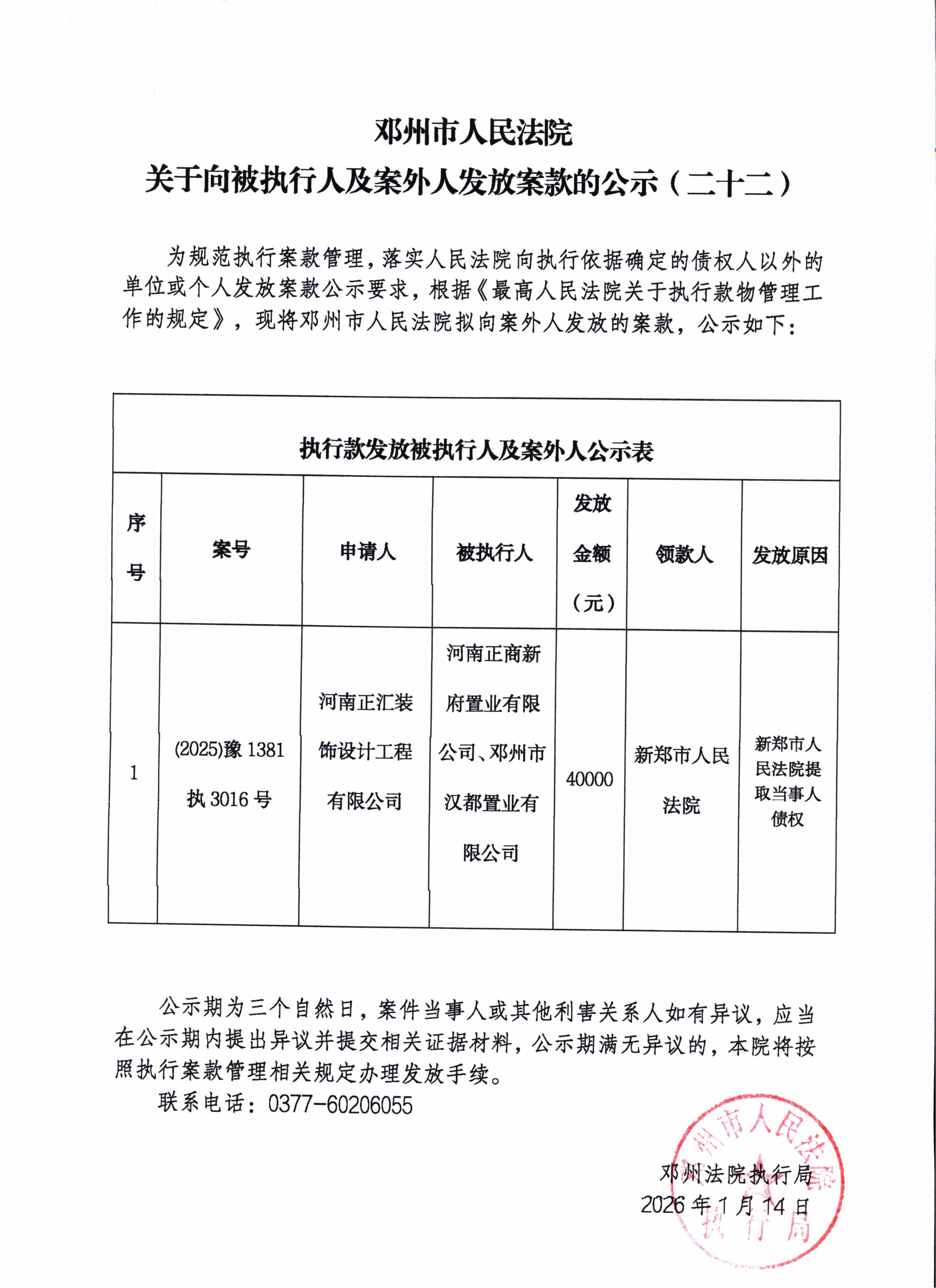 邓州市人民法院关于向被执行人及案外人发放案款的公示(二十二)
