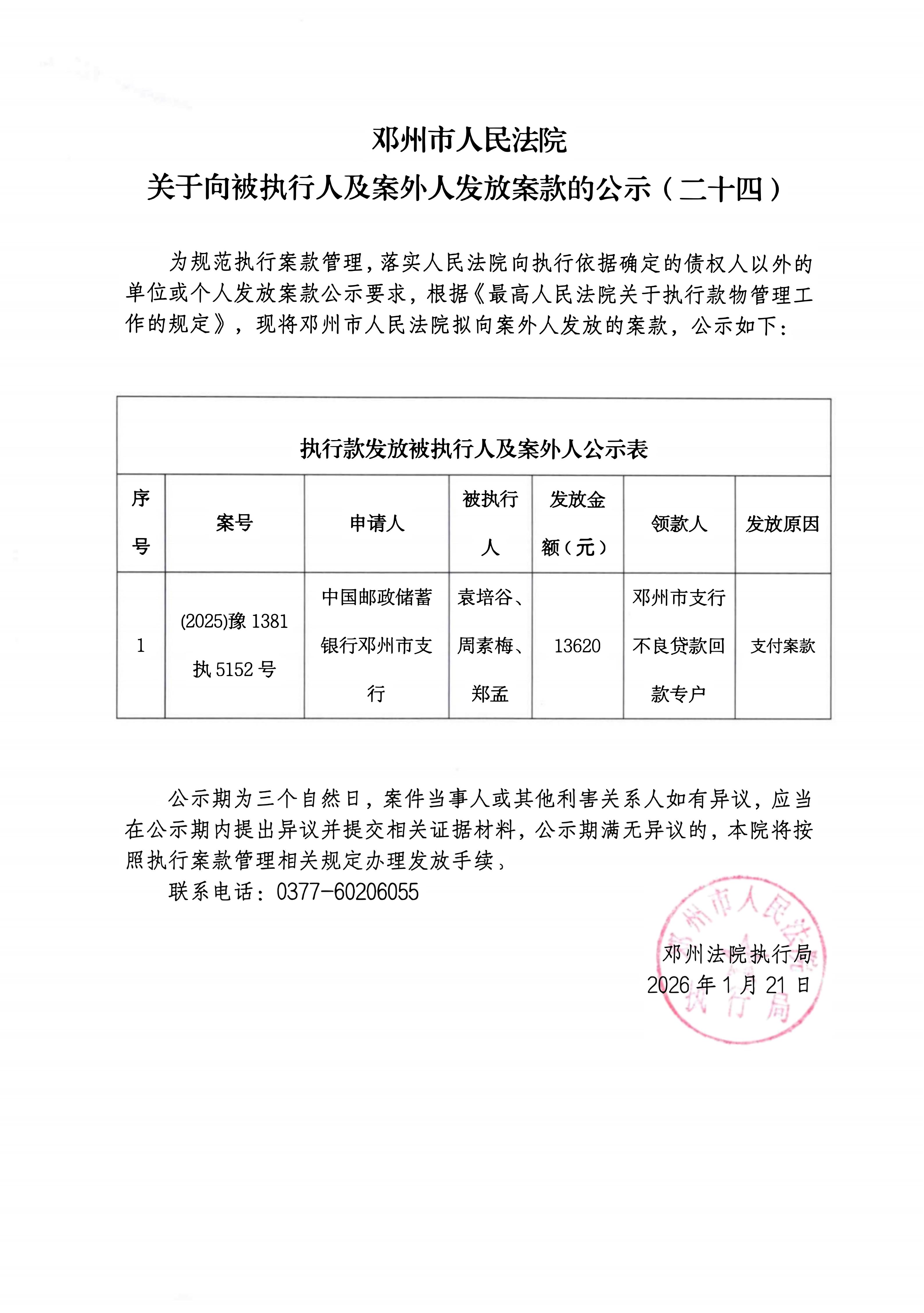 邓州市人民法院关于向被执行人及案外人发放案款的公示(二十四)