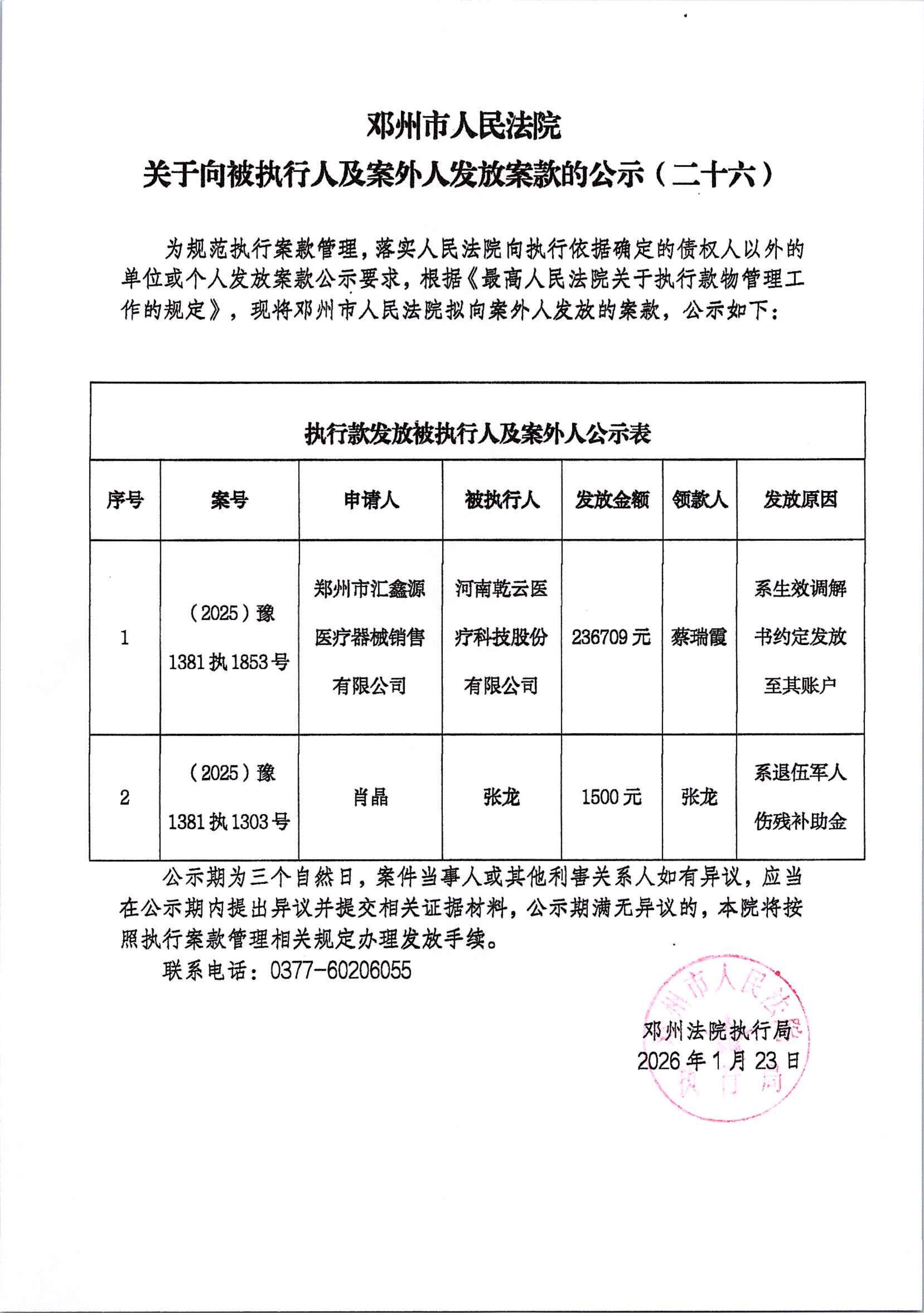 邓州市人民法院关于向被执行人及案外人发放案款的公示(二十六)