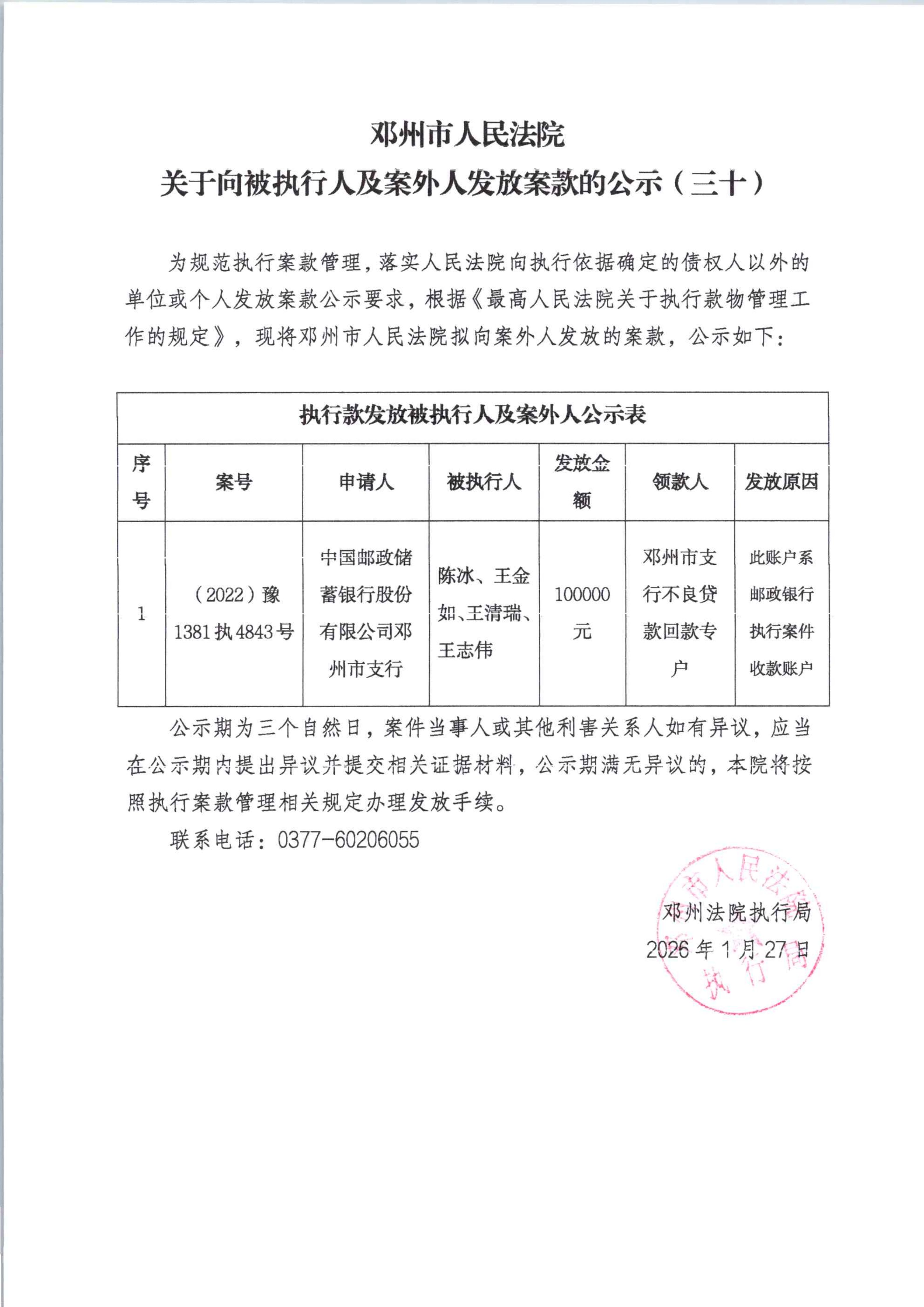 邓州市人民法院关于向被执行人及案外人发放案款的公示(三十)