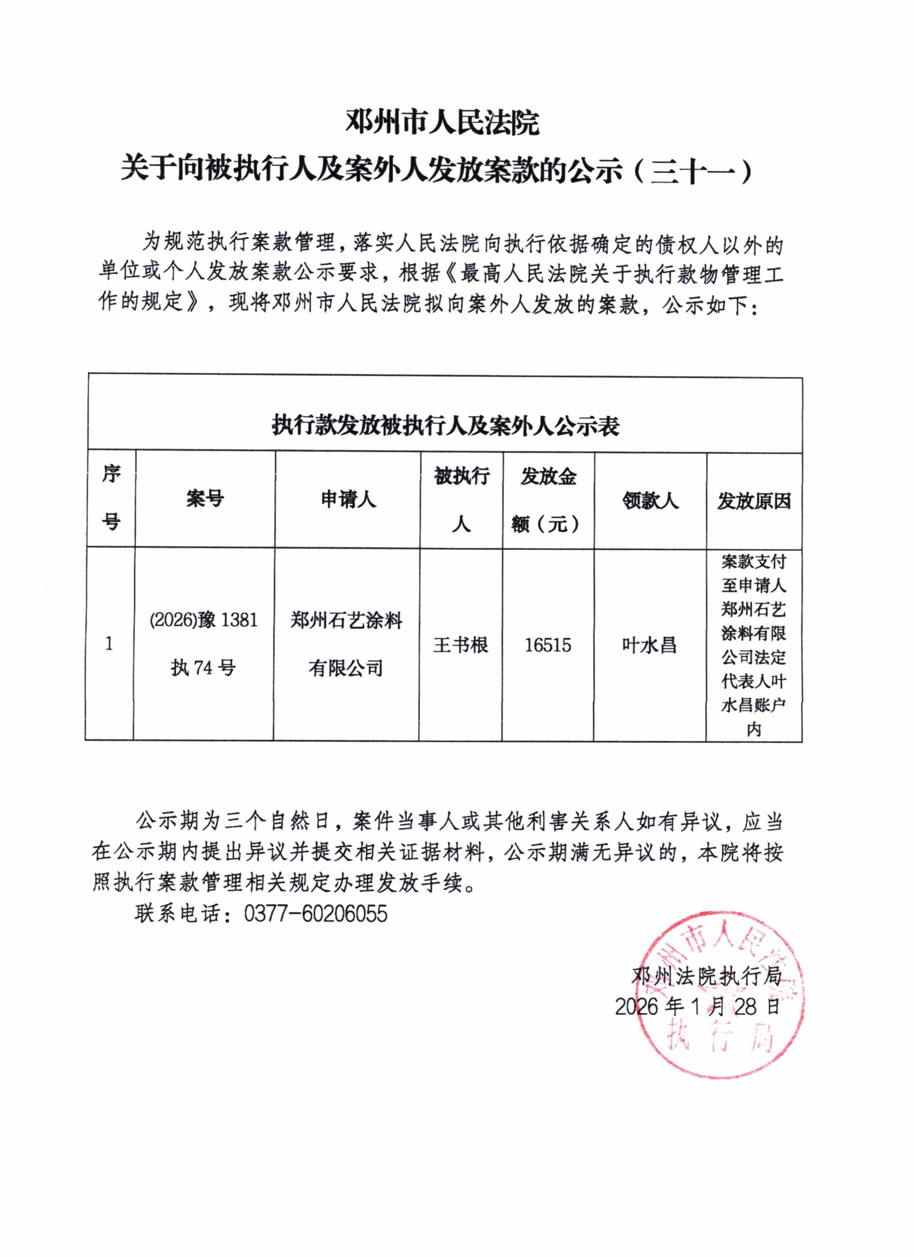 邓州市人民法院关于向被执行人及案外人发放案款的公示(三十一)