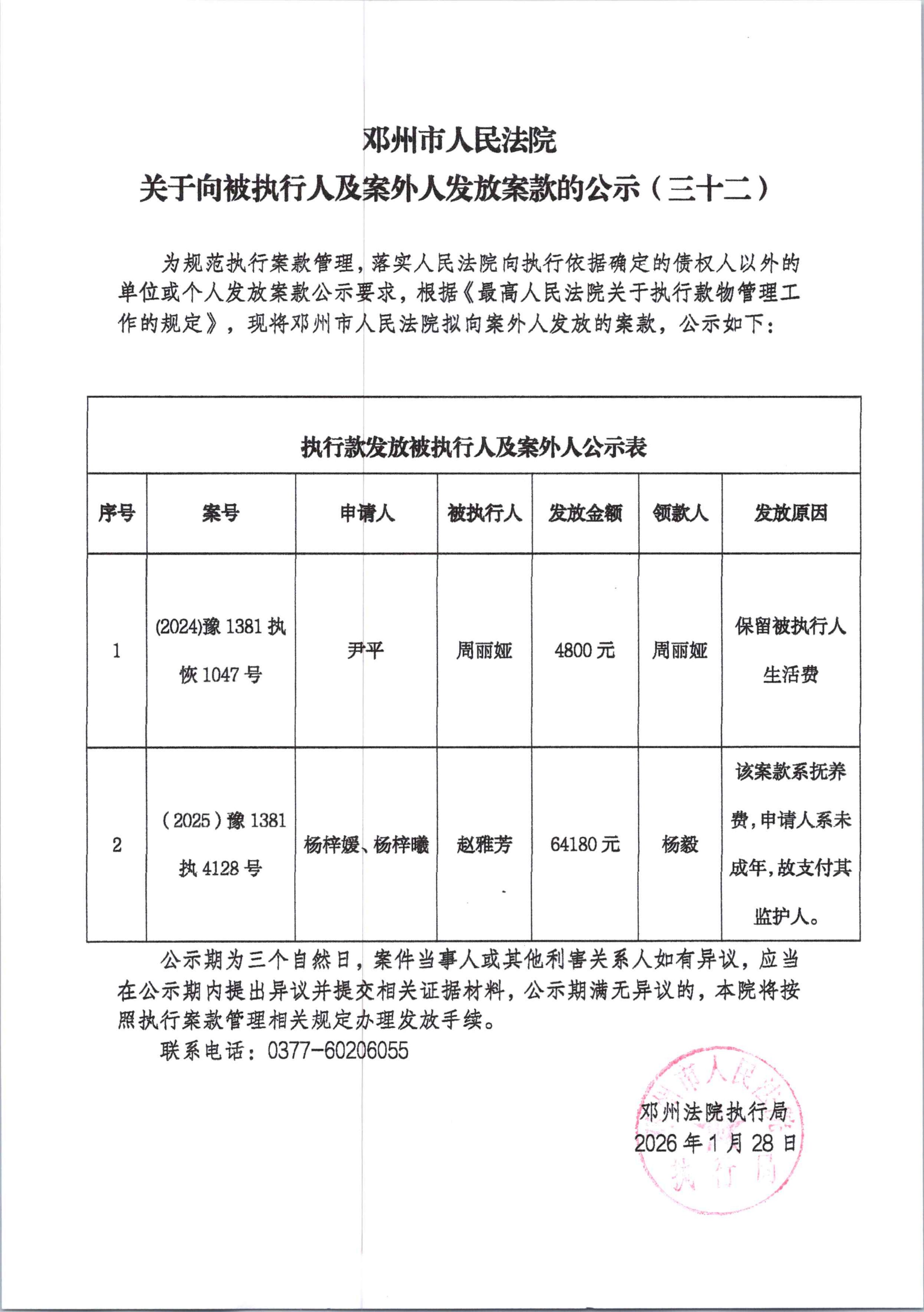 邓州市人民法院关于向被执行人及案外人发放案款的公示(三十二)