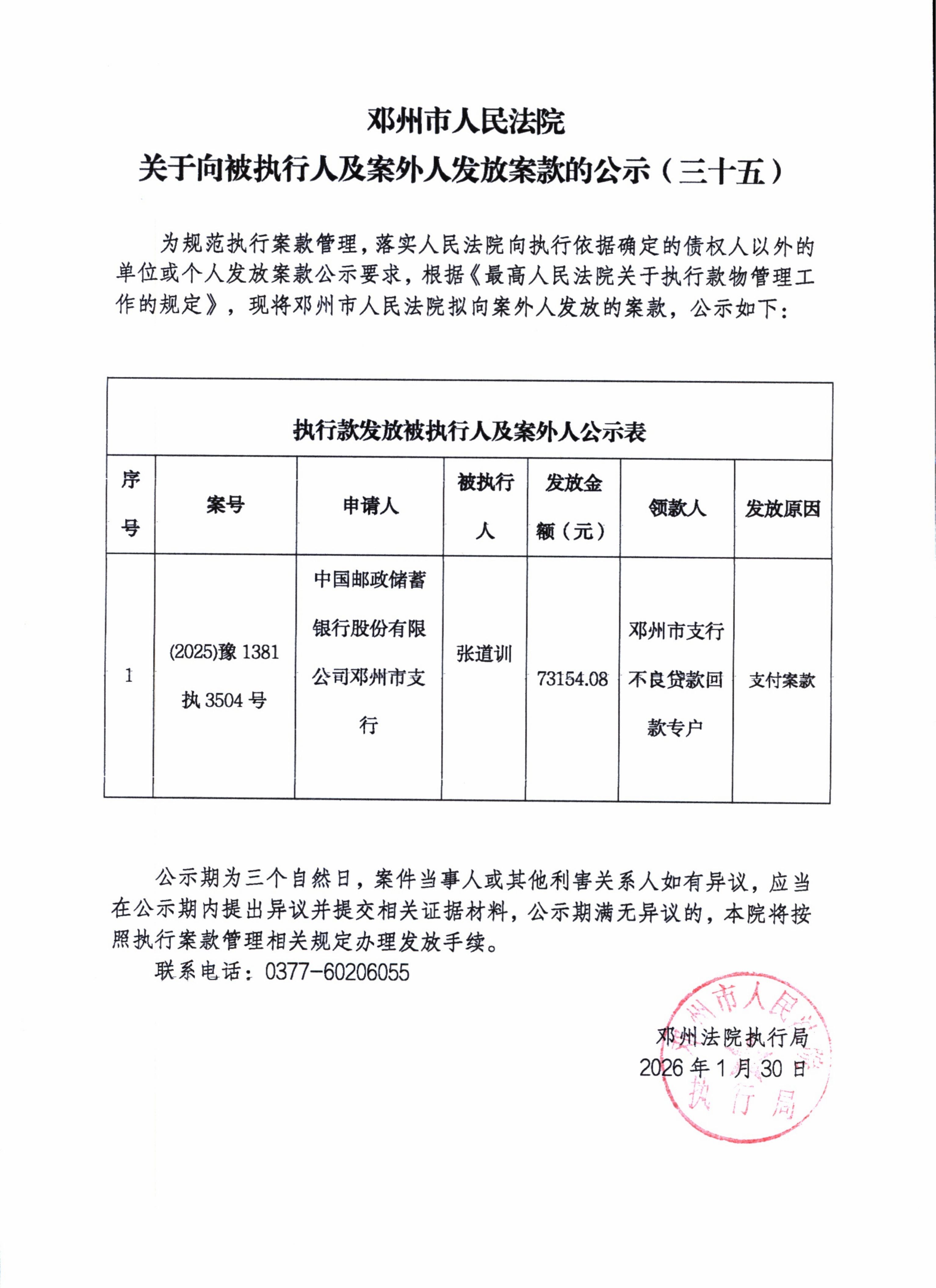 邓州市人民法院关于向被执行人及案外人发放案款的公示(三十五)