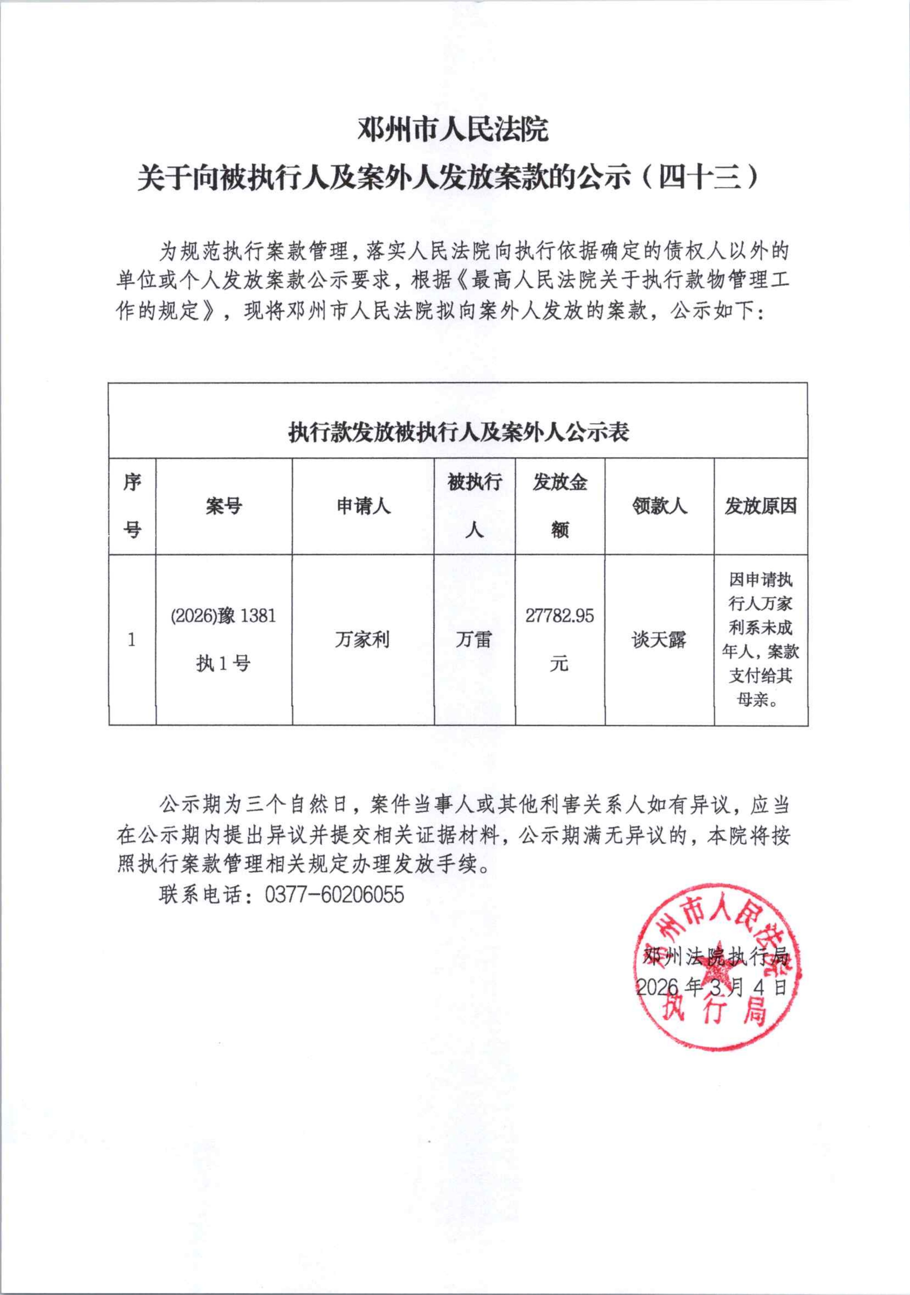 邓州市人民法院关于向被执行人及案外人发放案款的公示(四十三)