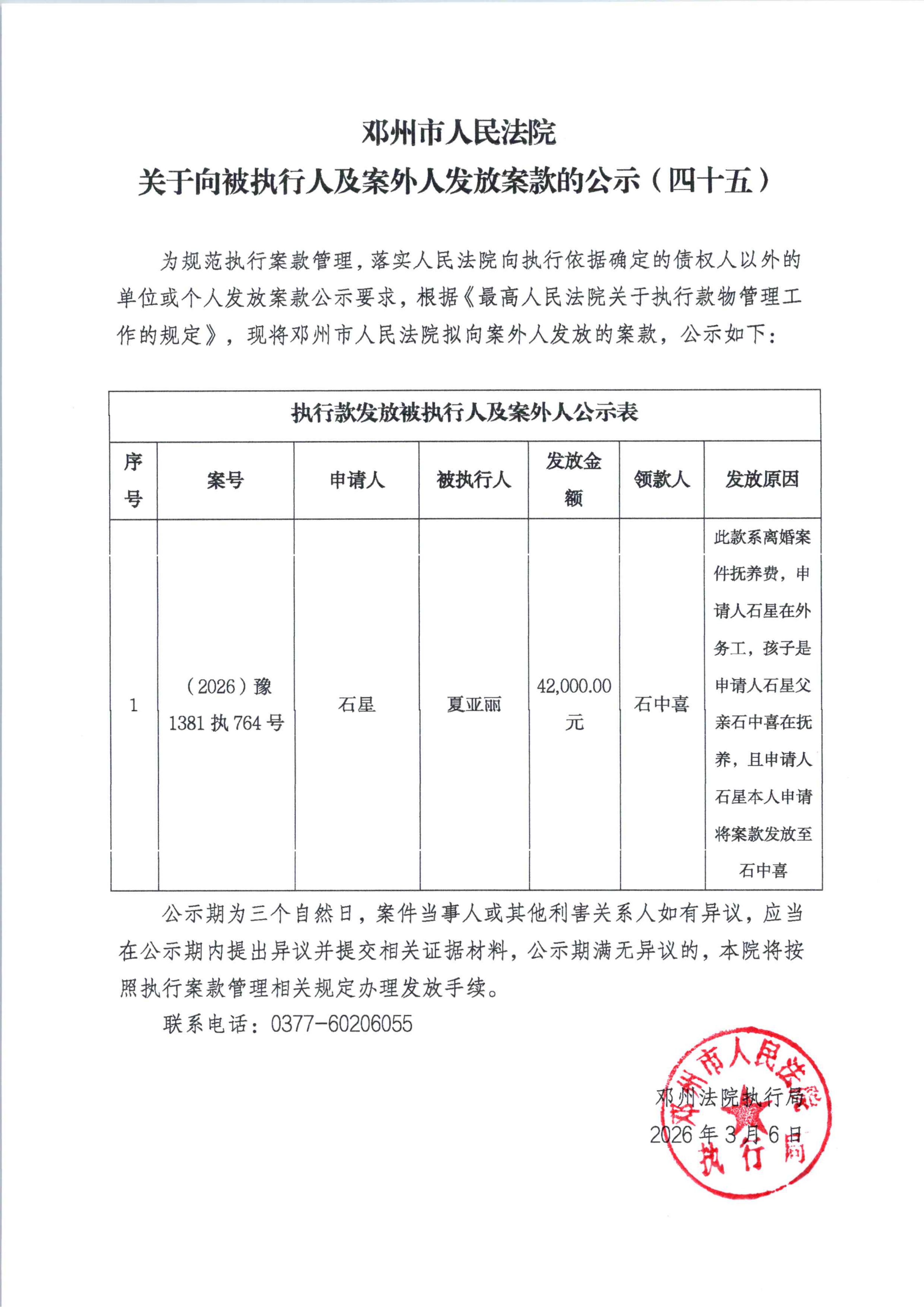 邓州市人民法院关于向被执行人及案外人发放案款的公示(四十五)